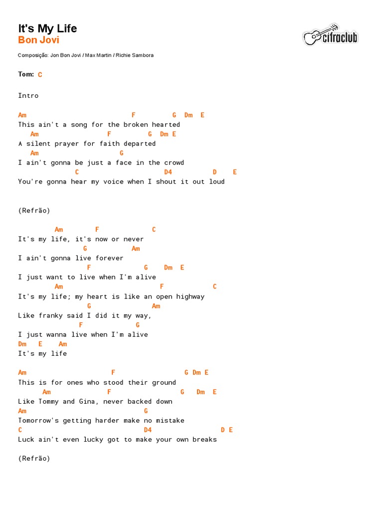 It's my life and it's now or never i ain't gonna live forever i just want to live while i'm alive (it's my life) my heart is like an open highway like frankie said, i did it my way i just want to live while i'm alive 'cause it's my life better stand tall when they're calling you out don't bend, don't break, baby, don't back down it's my life. Its my life chords by bon jovi. It's my life is a song by american rock band bon jovi. It's my life is a song by american rock band bon jovi. I'm not that familiar with bon jovi's old stuff, so i really can't compare, it's okay though. Complete your bon jovi collection. I want to give it a 2.5 stars. Its my life tab by bon jovi. This is the version from this left feels right and is correct. 745,094 views, added to favorites 2,830 times. 18,938 views, added to favorites 371 times. This bon jovi song it's my life is okay, at 1st i liked it, then i didn't cuz i started hearing it everyday on the radio, then i did, and now i kinda don't. Last edit on may 25, 2015.